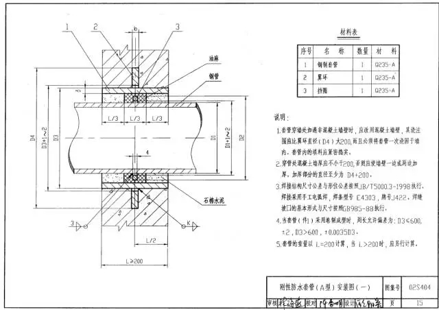 穿線密閉套管說明:1、當迎水面為腐蝕性介質時,可采用封堵材料將縫隙封堵;2.套管穿墻處如遇非混凝土墻壁時,應局部改用混凝土墻壁,其澆注范圍應比翼環(huán)直徑(DS)大200,并且必須將套管一次澆固…